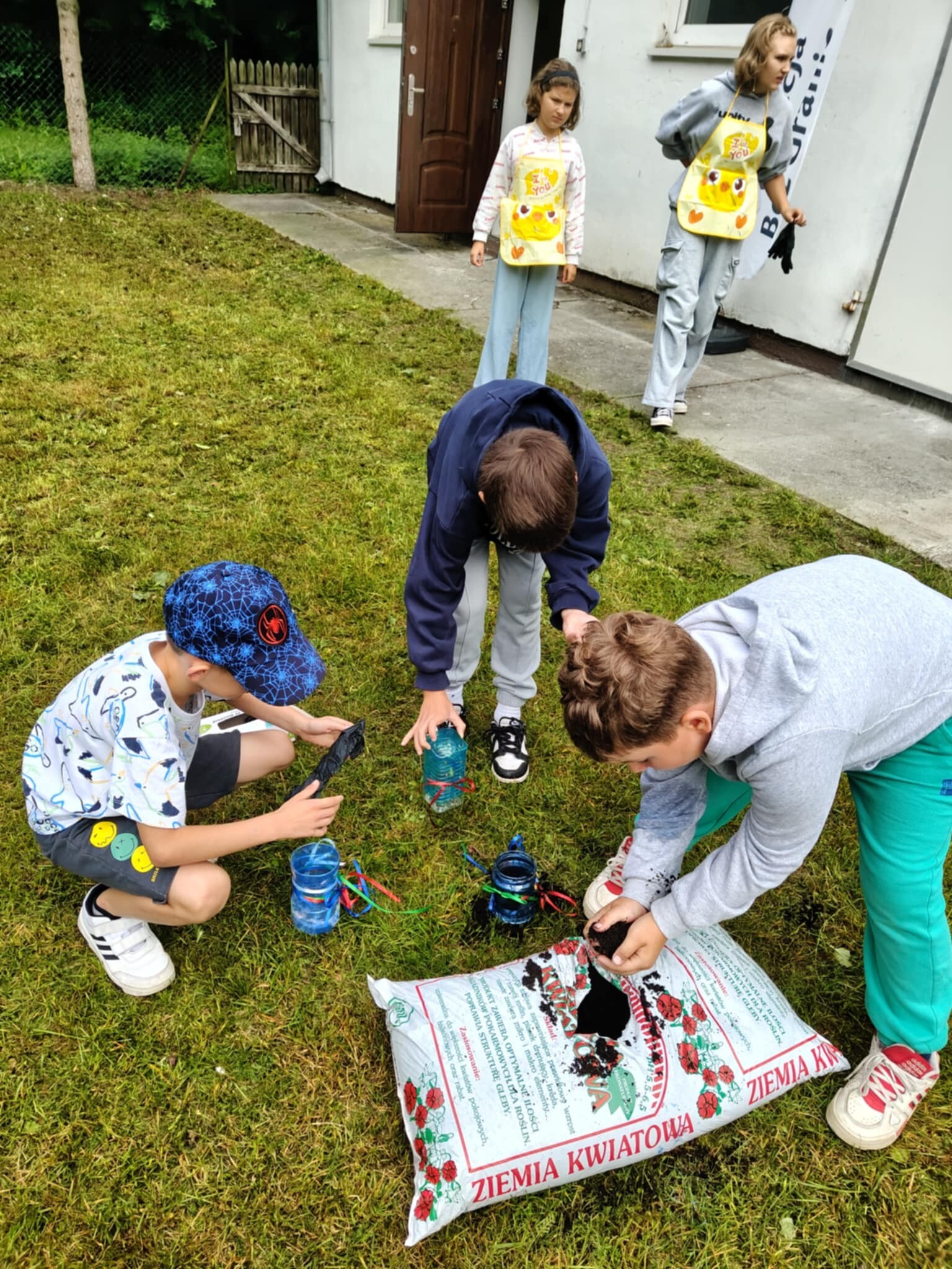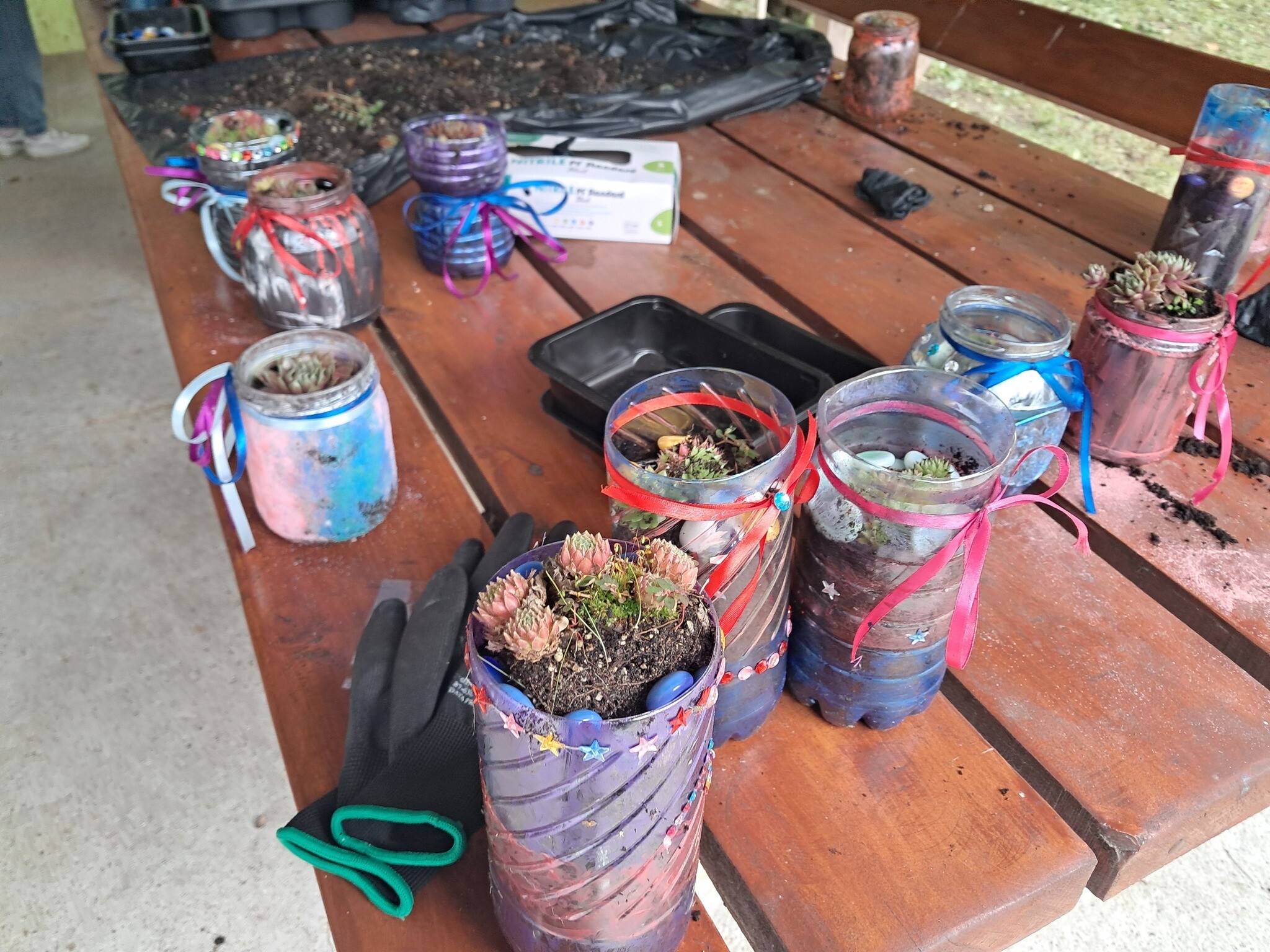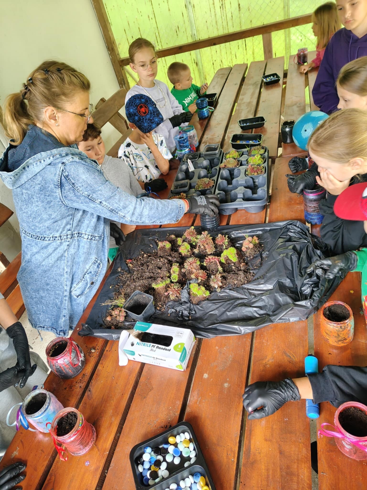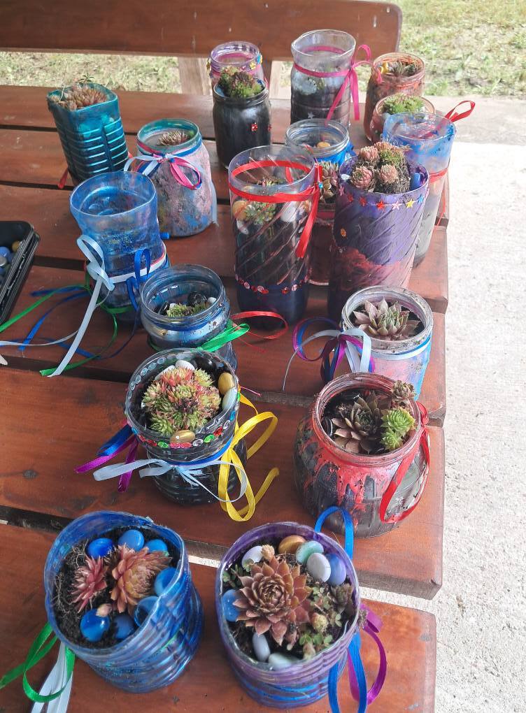 W otoczeniu zieleni i śpiewu ptaków odbyły się wyjątkowe eco-warsztaty, podczas których ze starych słoików, butelek i puszek powstały prawdziwe arcydzieła – doniczki wypełnione świeżo posadzonymi roślinkami.