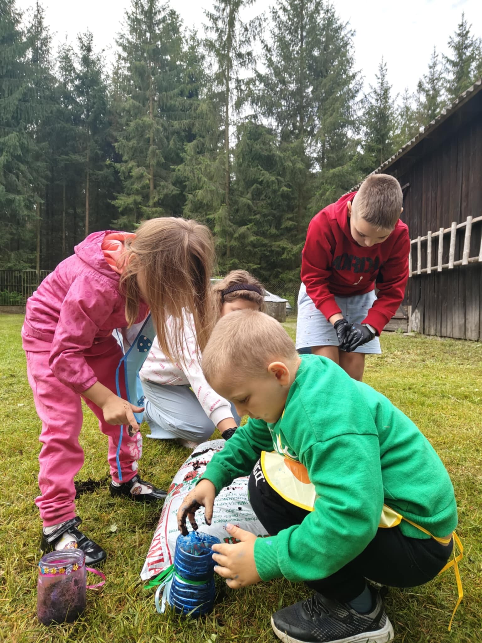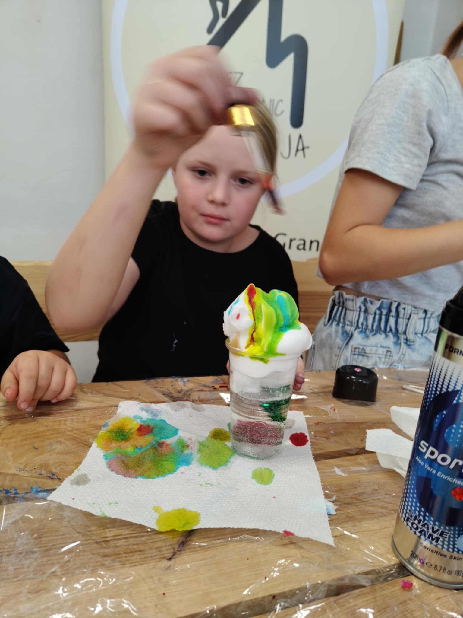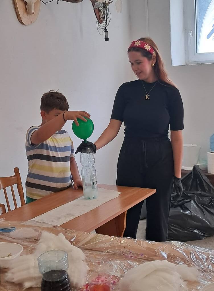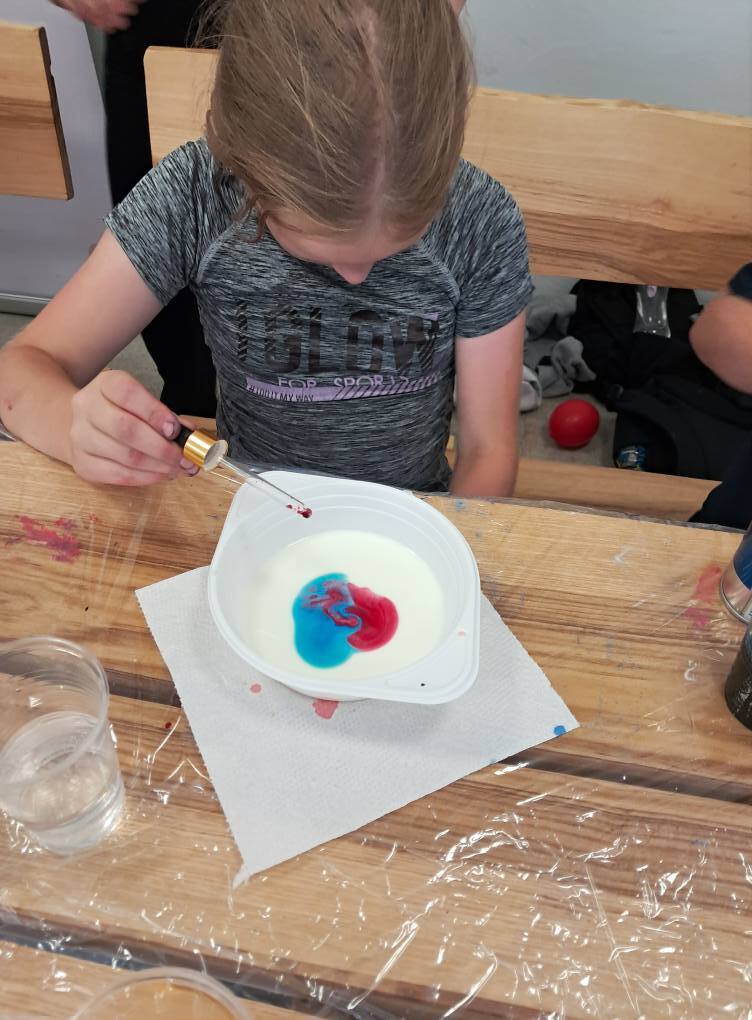 Po chwili relaksu wśród zapachu lasu nadszedł czas na fascynującą podróż do świata fizyki. Dzieci z zapartym tchem obserwowały wybuchowe reakcje sody z octem oraz magiczne kolory powstające po połączeniu mleka z płynem do mycia naczyń.