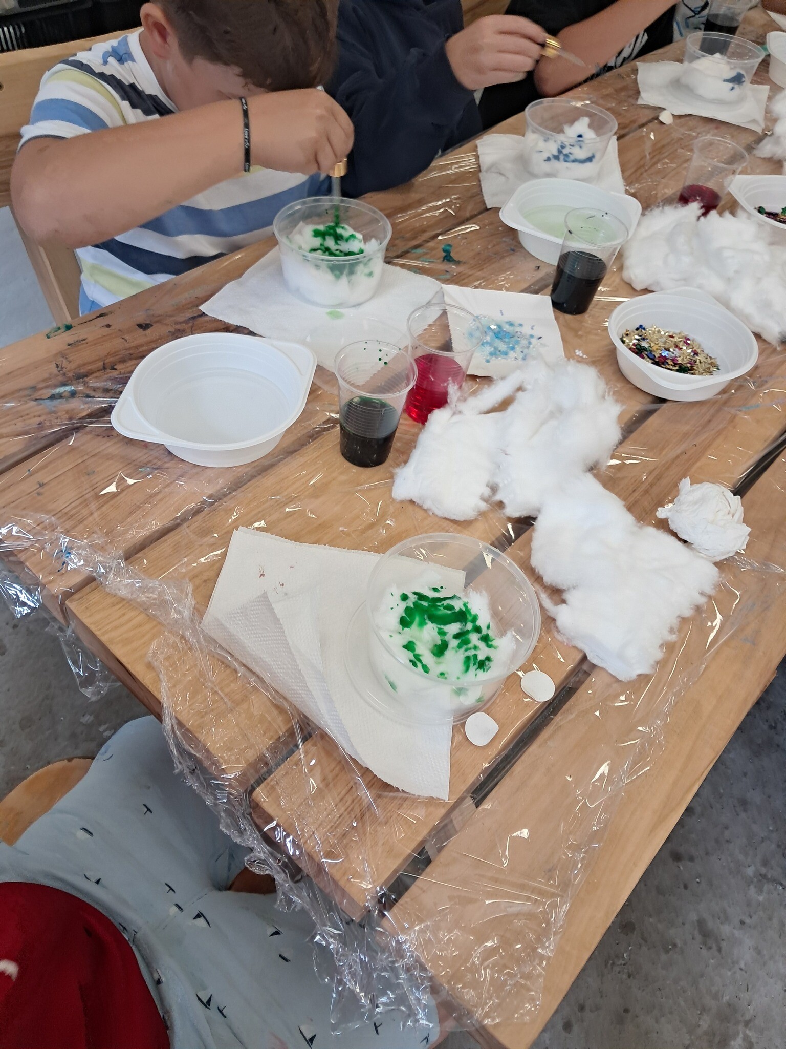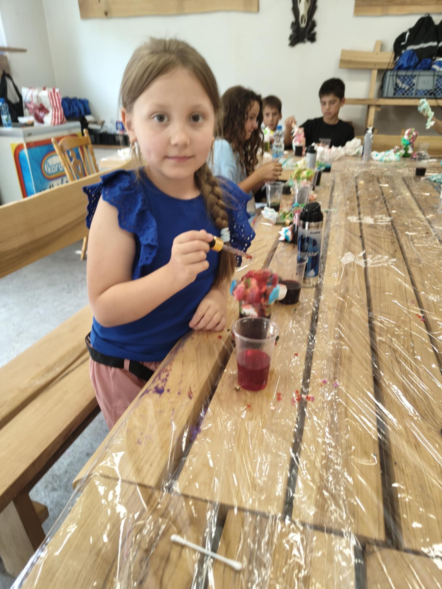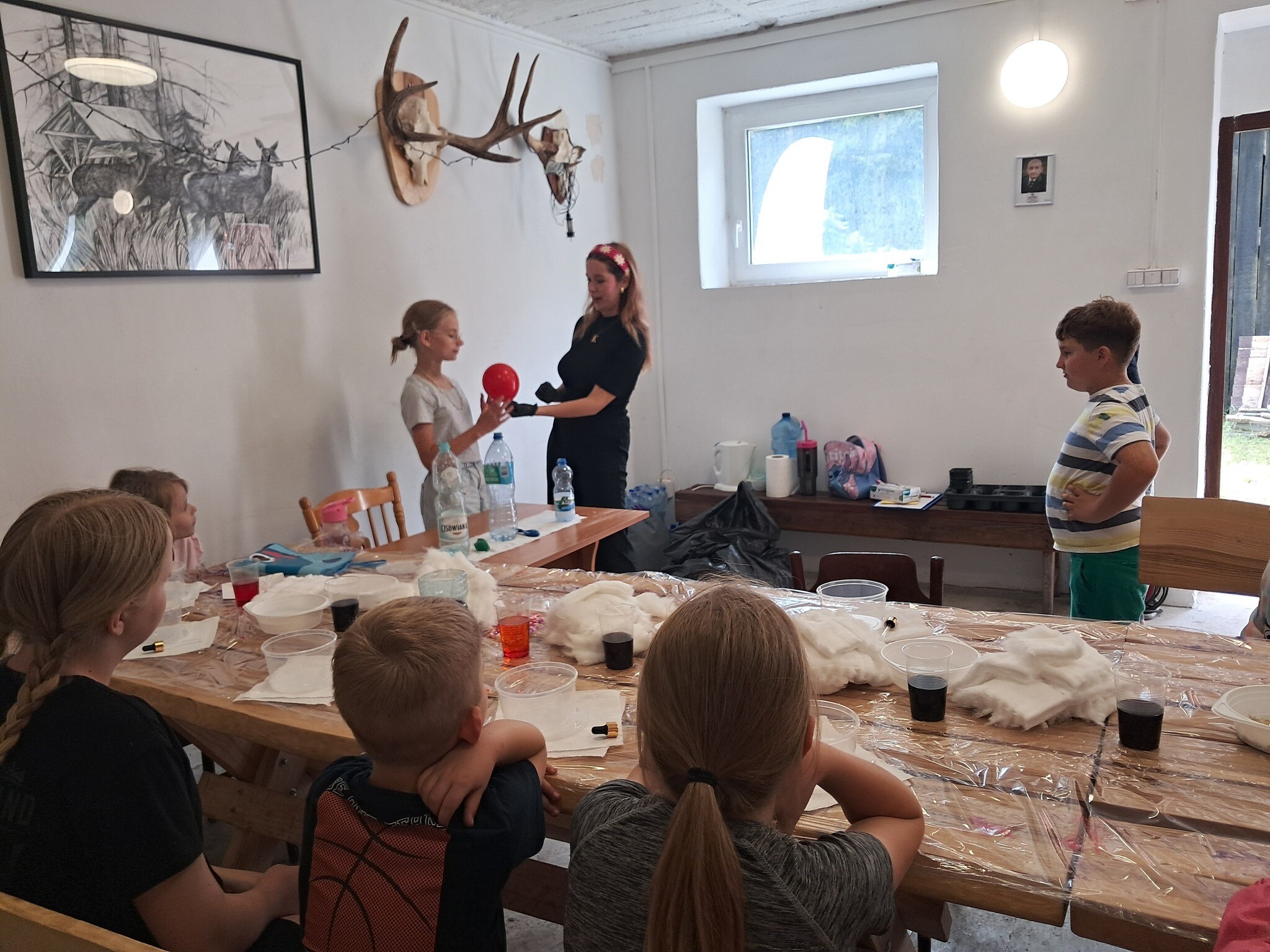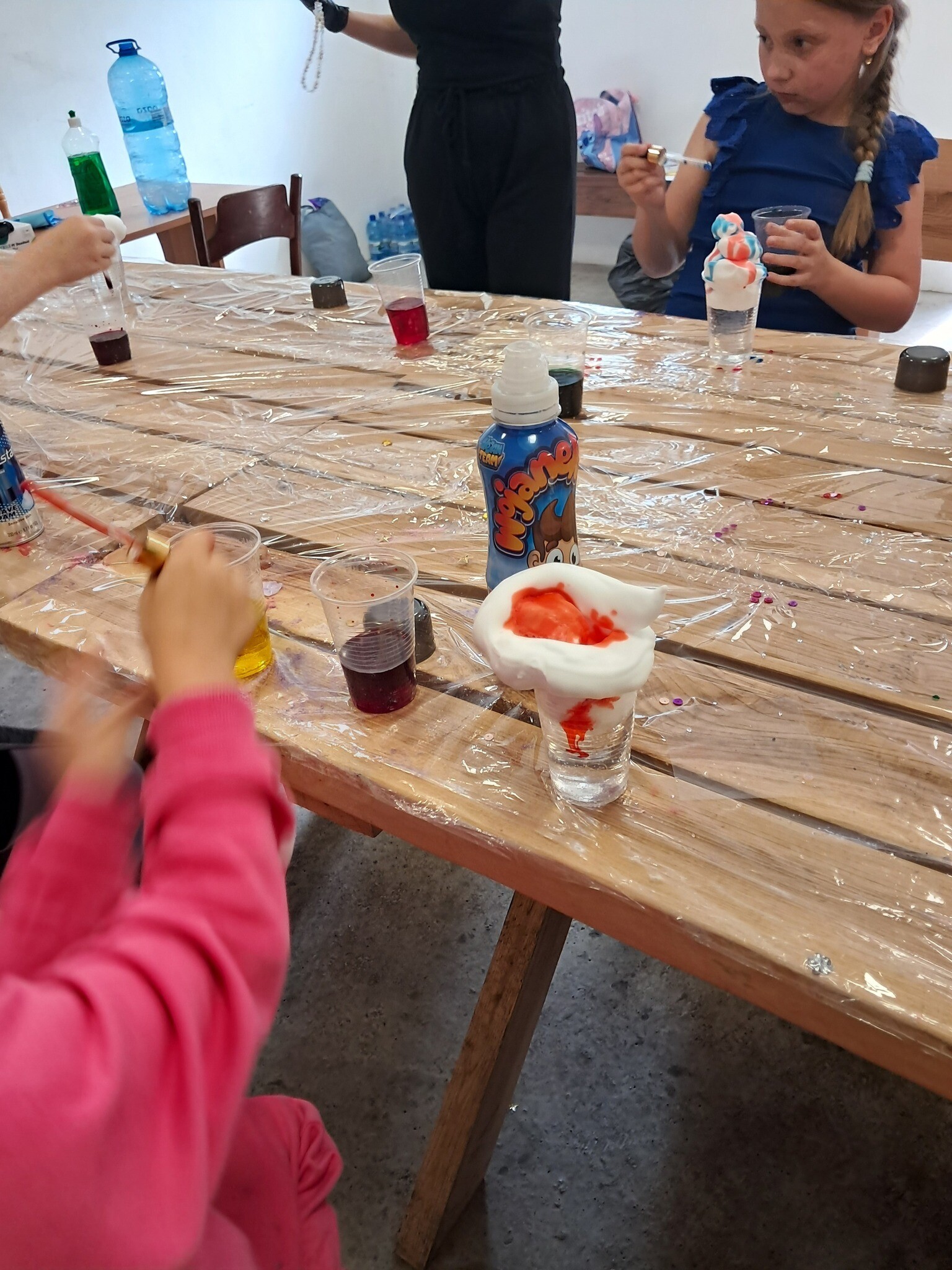 Po chwili relaksu wśród zapachu lasu nadszedł czas na fascynującą podróż do świata fizyki. Dzieci z zapartym tchem obserwowały wybuchowe reakcje sody z octem oraz magiczne kolory powstające po połączeniu mleka z płynem do mycia naczyń.